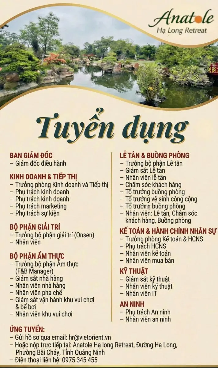 Anatole Hạ Long Retreat dự kiến sẽ mở cửa đón khách vào tháng 4/2026, do đó chúng tôi đang tìm kiếm những ứng viên nhiệt huyết, chuyên nghiệp để đồng hành trong giai đoạn chuẩn bị vận hành. Chúng tôi tuyển dụng nhiều vị trí ở các bộ phận: